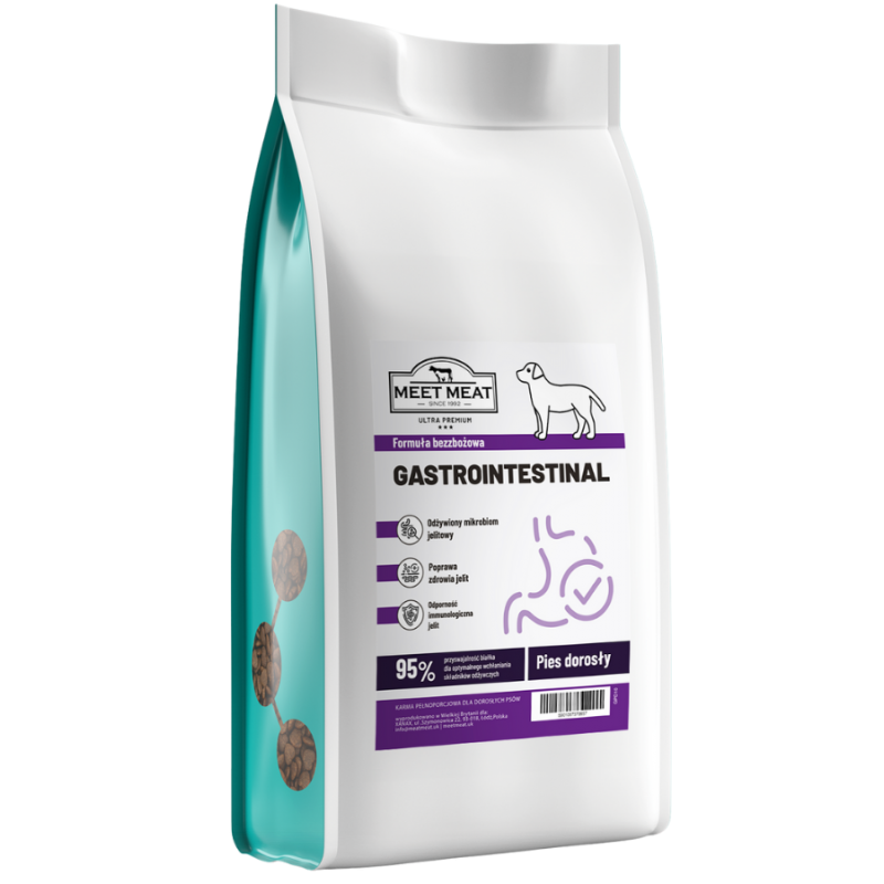MEET MEAT Gastrointestinal – Zdrowie Układu Trawiennego to karma z serii funkcjonalnych karm MEET MEAT, stworzona z myślą o dorosłych psach z wrażliwym przewodem pokarmowym, skłonnością do zaburzeń trawienia lub nieregularnej konsystencji stolca. Receptura została zaprojektowana tak, aby wspierać jelita nie tylko objawowo, ale również długofalowo - poprzez poprawę strawności diety i lepsze wykorzystanie składników odżywczych.