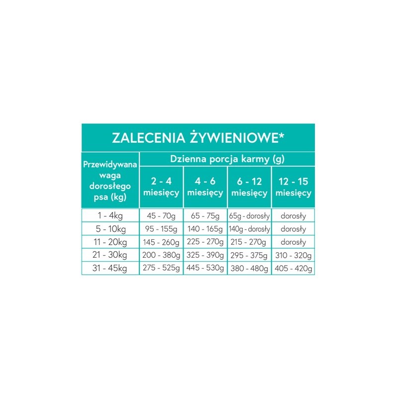 *Każdy pies jest inny, dlatego stosując przedstawione zalecenia należy wziąć pod uwagę rasę, wiek, temperament i poziom aktywności danego psa. Przy zmianie karmy nowy produkt należy przez pierwsze dwa tygodnie wprowadzać stopniowo. Psu należy zapewnić stały dostęp do świeżej wody.