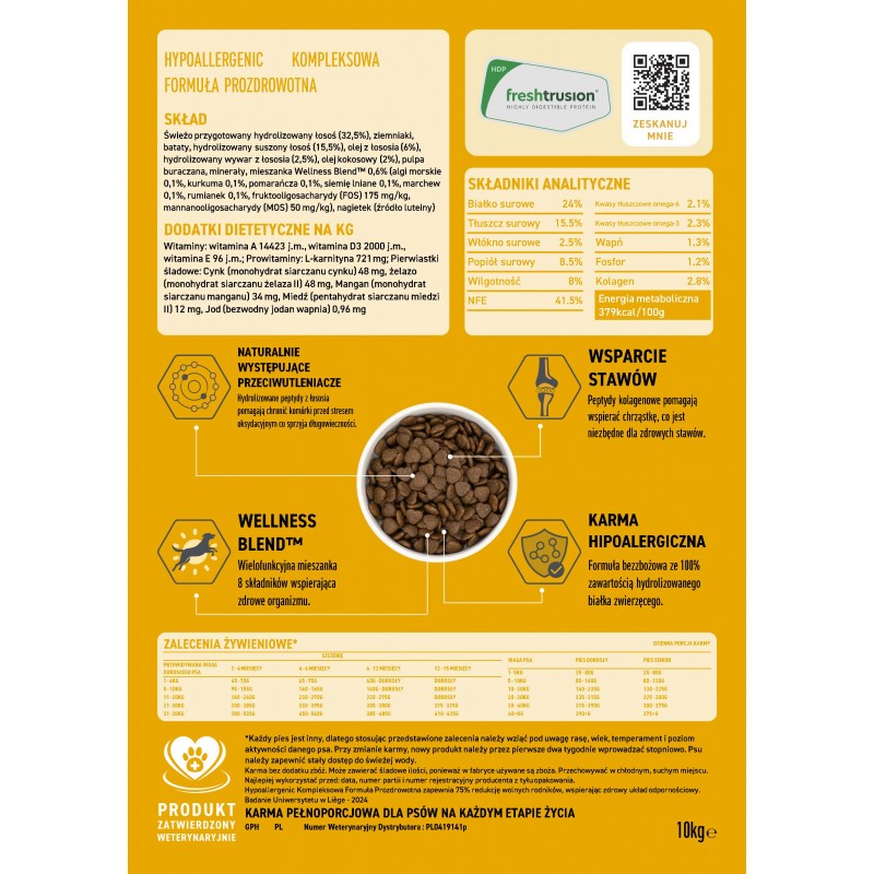 Podstawą receptury jest hydrolizowany łosoś jako jedyne źródło białka zwierzęcego, co znacząco ogranicza ryzyko reakcji alergicznych i poprawia tolerancję karmy. Proces hydrolizy sprawia, że białko jest łatwiej przyswajalne i mniej obciążające dla układu pokarmowego, dzięki czemu karma sprawdzi się również u psów z wrażliwym przewodem pokarmowym.