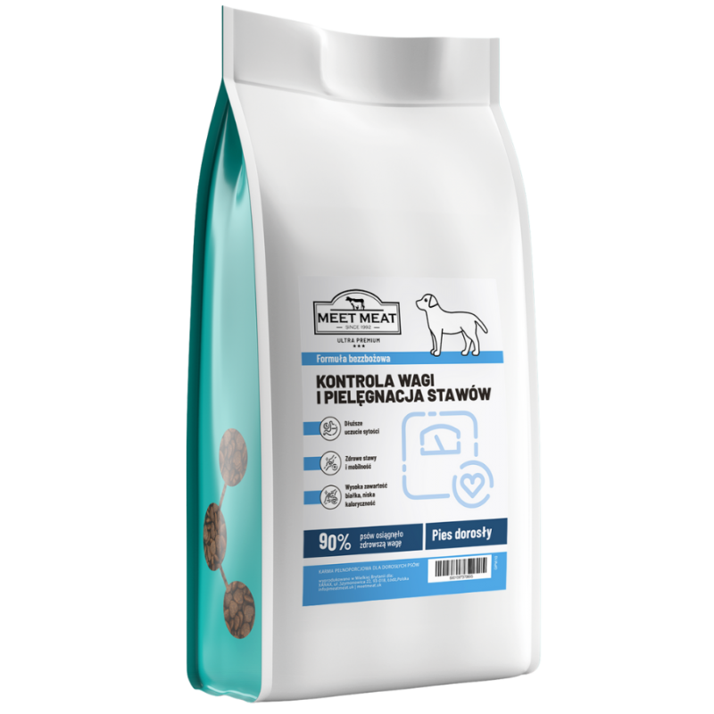 MEET MEAT Kontrola Wagi i Pielęgnacja Stawów to karma z funkcjonalnej serii MEET MEAT, stworzona dla dorosłych psów z tendencją do nadwagi, po sterylizacji lub o obniżonej aktywności fizycznej. Nadmierna masa ciała stanowi istotne obciążenie dla stawów i układu ruchu, dlatego receptura łączy kontrolowaną kaloryczność z aktywnym wsparciem aparatu ruchu.