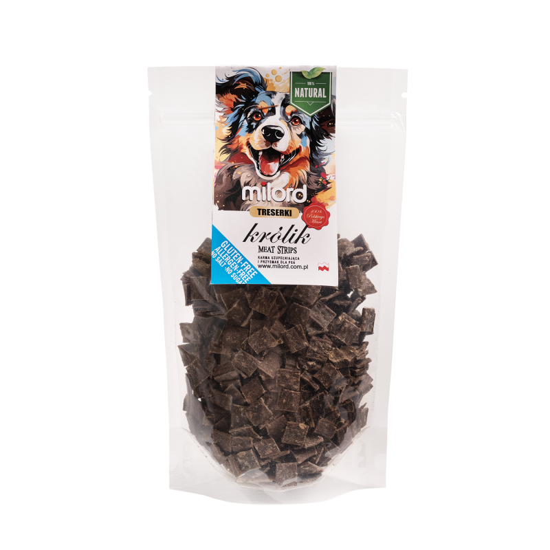 Milord Meat Treserki Królik to naturalne, monobiałkowe przysmaki treningowe z 100% mięsa królika, idealne dla psów z alergiami i wrażliwym układem pokarmowym.