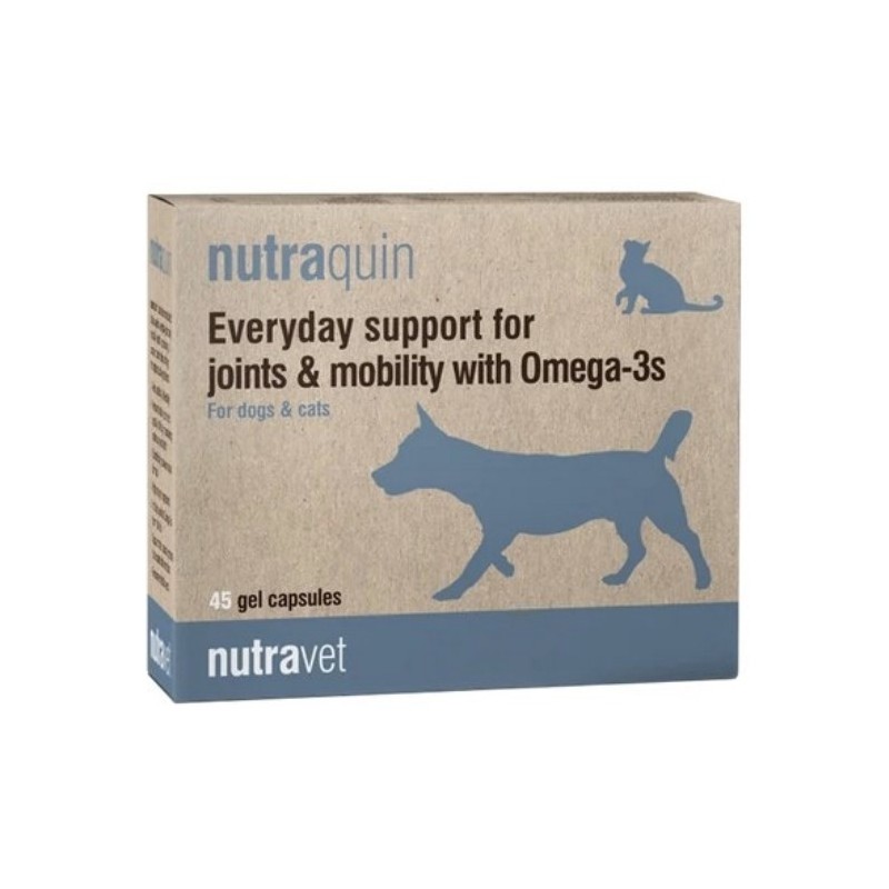 Nutraquin to karma uzupełniająca dla psów i kotów. Każdą kapsułkę należy podawać zwierzęciu w całości doustnie lub nakłuć, a zawartość wycisnąć na porcję pożywienia. Po okresie wysycenia (6 tygodni) dawka podtrzymująca powinna być podawana dożywotnio.