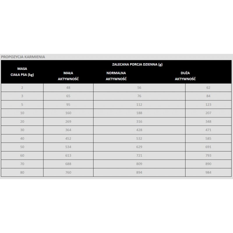 Podane w tabeli dzienne zapotrzebowanie jest orientacyjne. Każdy pies jest inny i ma rożne potrzeby. Obserwuj swojego zwierzaka i zwiększ lub zmniejsz jego porcję dzienną karmy w razie potrzeby. Pamiętaj, aby zapewnić mu stały dostęp do świeżej wody!