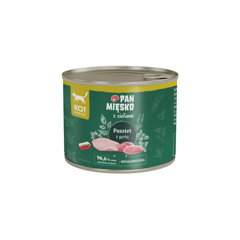 PAN MIĘSKO Pasztet z gęsią i ziołami to pełnoporcjowa mokra karma dla dorosłych kotów, oparta na naturalnych potrzebach mięsożerców i stworzona z myślą o najwyższej jakości żywieniu. Receptura zawiera aż 96,6% mięsa, podrobów i bulionu, dzięki czemu dostarcza kotu doskonale przyswajalnego białka oraz cennych składników odżywczych niezbędnych do codziennej witalności.