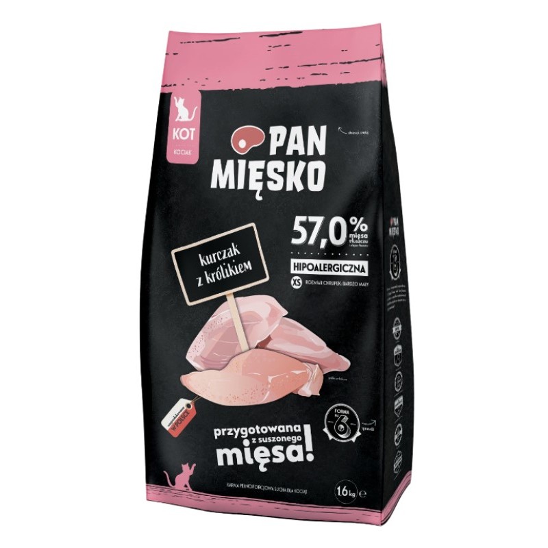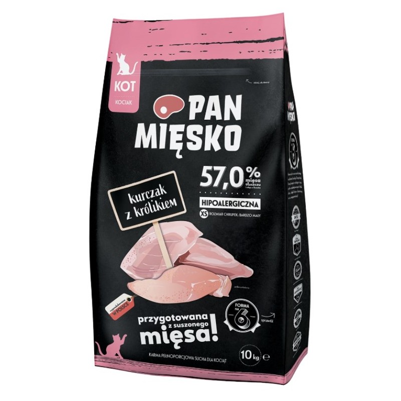 Uszkodzone opakowanie. Waga 3,8kg. Termin ważności 14.01.2027. Pełnoporcjowa, sucha karma Pan Mięsko o smaku kurczaka z królikiem dla kociąt.