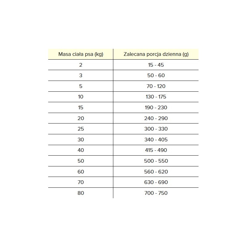 Podane w tabeli dzienne zapotrzebowanie jest orientacyjne. Każdy pies jest inny i ma różne potrzeby. Obserwuj swojego zwierzaka i zwiększ lub zmniejsz porcję dzienną karmy w razie potrzeby. Pamiętaj, aby zapewnić mu stały dostęp do świeżej wody!