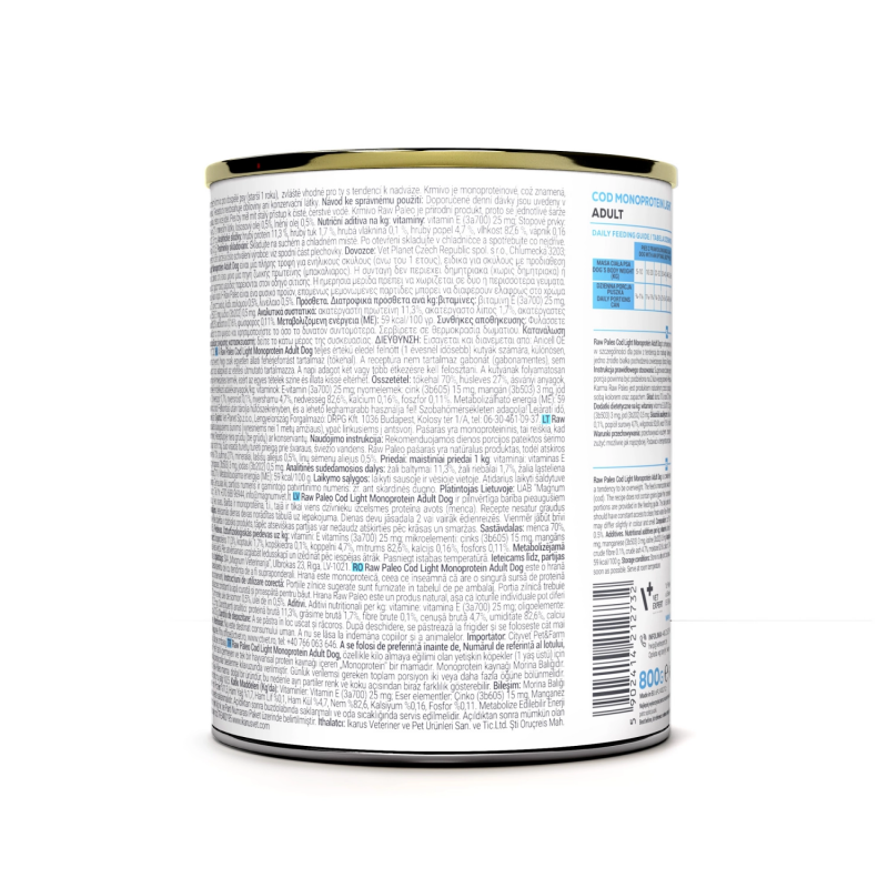 RAW PALEO COD LIGHT MONOPROTEIN ADULT DOG to naturalna, delikatna i wyjątkowo lekkostrawna mokra karma w formie soczystego, miękkiego pasztetu, stworzona specjalnie dla dorosłych psów – szczególnie tych z nadwagą lub tendencją do przybierania na wadze. Jej monobiałkowa receptura, oparta wyłącznie na dorszu, gwarantuje wysoką przyswajalność, bardzo niską zawartość tłuszczu oraz minimalizuje ryzyko alergii i nietolerancji pokarmowych.