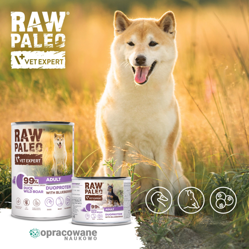 RAW PALEO Duck & Boar Adult Can to naturalna, delikatna i wyjątkowo smakowita mokra karma w formie miękkiego, soczystego pasztetu, stworzona specjalnie dla dorosłych psów powyżej 1. roku życia. Jej duoproteinowa receptura – oparta na kaczce i dziku – zapewnia wysoką przyswajalność, bogaty profil aminokwasowy oraz minimalizuje ryzyko alergii i nietolerancji pokarmowych. To doskonały wybór dla psów wymagających wartościowej, lekkostrawnej i naturalnej diety.