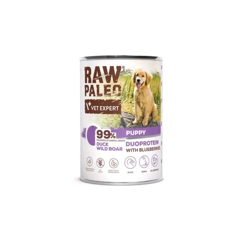 RAW PALEO DUCK & BOAR PUPPY CAN to naturalna, delikatna i wyjątkowo smakowita mokra karma w formie miękkiego, soczystego pasztetu, stworzona specjalnie dla psów rosnących. Jej duoproteinowa receptura, oparta na kaczce i dziku, gwarantuje wysoką przyswajalność, wartościowy profil aminokwasowy oraz minimalizuje ryzyko alergii i nietolerancji pokarmowych.