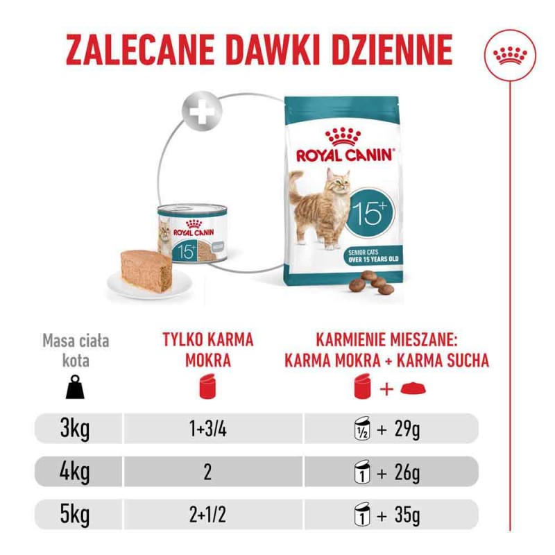 Karma ROYAL CANIN® AGEING 15+ dostępna jest zarówno w postaci suchej, jak i mokrej, w różnych wariantach: kawałki w sosie oraz delikatny mus. Karmienie mieszane pomaga pobudzić apetyt kota poprzez urozmaicenie konsystencji podawanego mu pokarmu i zaspokojenie jego indywidualnych preferencji.
