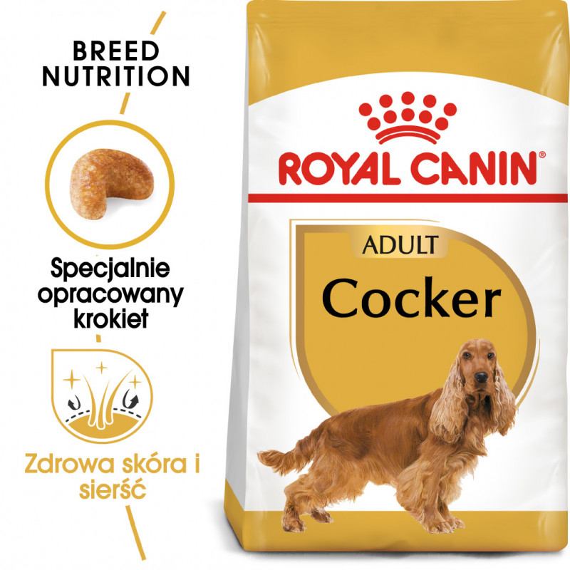 Uszkodzone opakowanie. Brak ubytku. Termin ważności 06.08.2026. Karma ROYAL CANIN® Cocker Adult została opracowana specjalnie dla dorosłych psów, powyżej 12 miesiąca życia, rasy cocker spaniel.