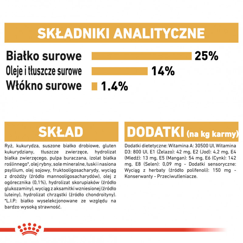 - ryż, kukurydza, suszone białko drobiowe, gluten kukurydziany, tłuszcze zwierzęce, hydrolizat białka zwierzęcego, pulpa buraczana, izolat białka roślinnego*, olej rybny, sole mineralne, łuski i nasiona psyllium, olej sojowy, fruktooligosacharydy, wyciąg z drożdży (źródło mannooligosacharydów), olej z ogórecznika (0,1%), hydrolizat skorupiaków (źródło glukozaminy), wyciąg z aksamitki wzniesionej (źródło luteiny), hydrolizat chrząstki (źródło chondroityny).