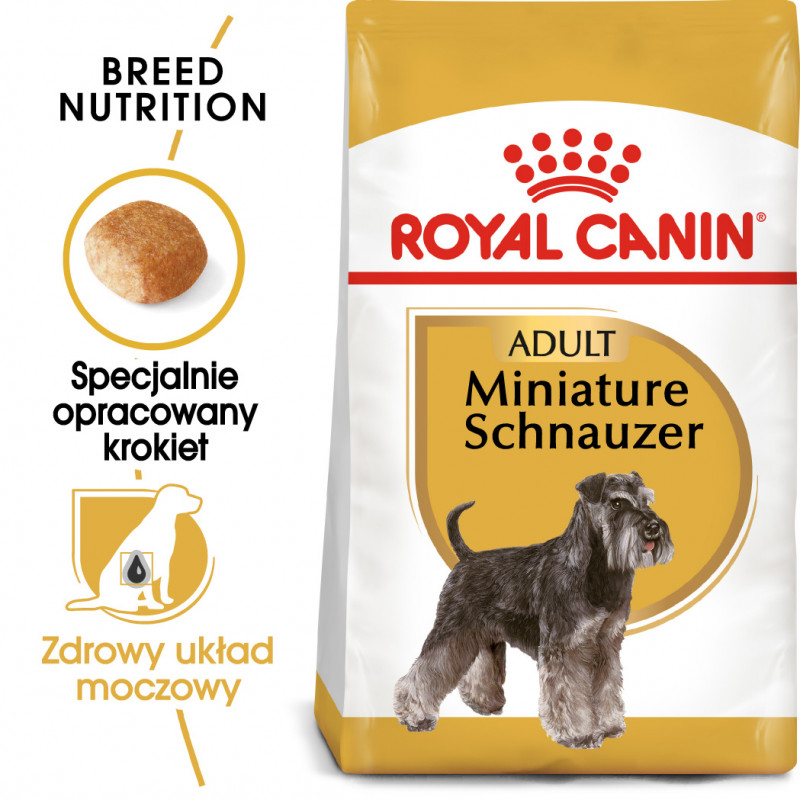 Uszkodzone opakowanie. Brak ubytku. Termin ważności 11.01.2026. Karma ROYAL CANIN® Miniature Schnauzer Adult, przeznaczona dla psów rasy sznaucer miniaturowy powyżej 10 miesiąca życia, została opracowana specjalnie pod kątem potrzeb Twojego dorosłego psa.