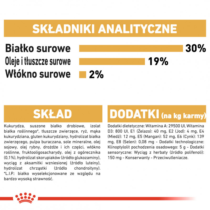 - kukurydza, suszone białko drobiowe, izolat białka roślinnego*, tłuszcze zwierzęce, ryż, mąka kukurydziana, gluten kukurydziany, hydrolizat białka zwierzęcego, pulpa buraczana, sole mineralne, olej sojowy, olej rybny, drożdże i ich części, włókno roślinne, fruktooligosacharydy, olej z ogórecznika (0,1%), hydrolizat skorupiaków (źródło glukozaminy), wyciąg z aksamitki wzniesionej (źródło luteiny), hydrolizat chrząstki (źródło chondroityny).