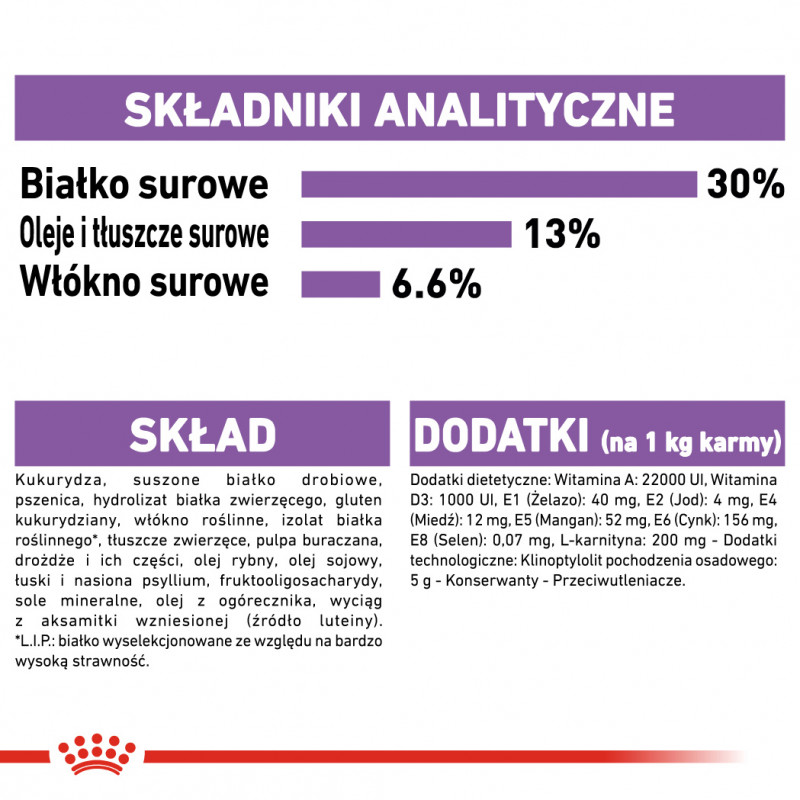 Ponadto, karma ROYAL CANIN® Sterilised Mini jest bogata w wysokostrawne białka, zapewniające twojemu psu utrzymanie masy mięśniowej, natomiast zawartość kalorii (energii) została odpowiednio zmniejszona.