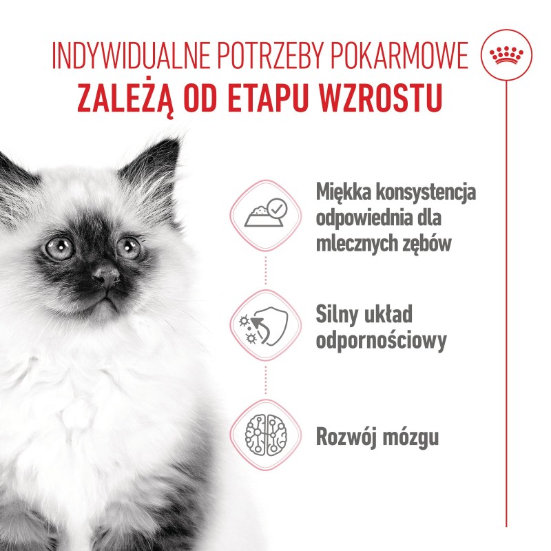 Karma dla kociąt ROYAL CANIN® Kitten została opracowana specjalnie w celu pokrycia potrzeb pokarmowych kociąt w drugim etapie wzrostu. Receptura jest odpowiednia dla kociąt w wieku 4-12 miesięcy, w okresie znacznych zmian fizycznych i behawioralnych.