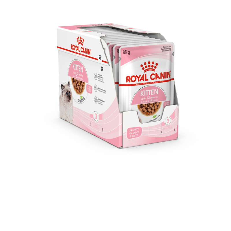 Karma mokra ROYAL CANIN® Kitten w sosie została opracowana specjalnie w celu pokrycia potrzeb pokarmowych kociąt w drugim etapie wzrostu. Receptura jest odpowiednia dla kociąt w wieku 4-12 miesięcy, w okresie znacznych zmian fizycznych i behawioralnych.