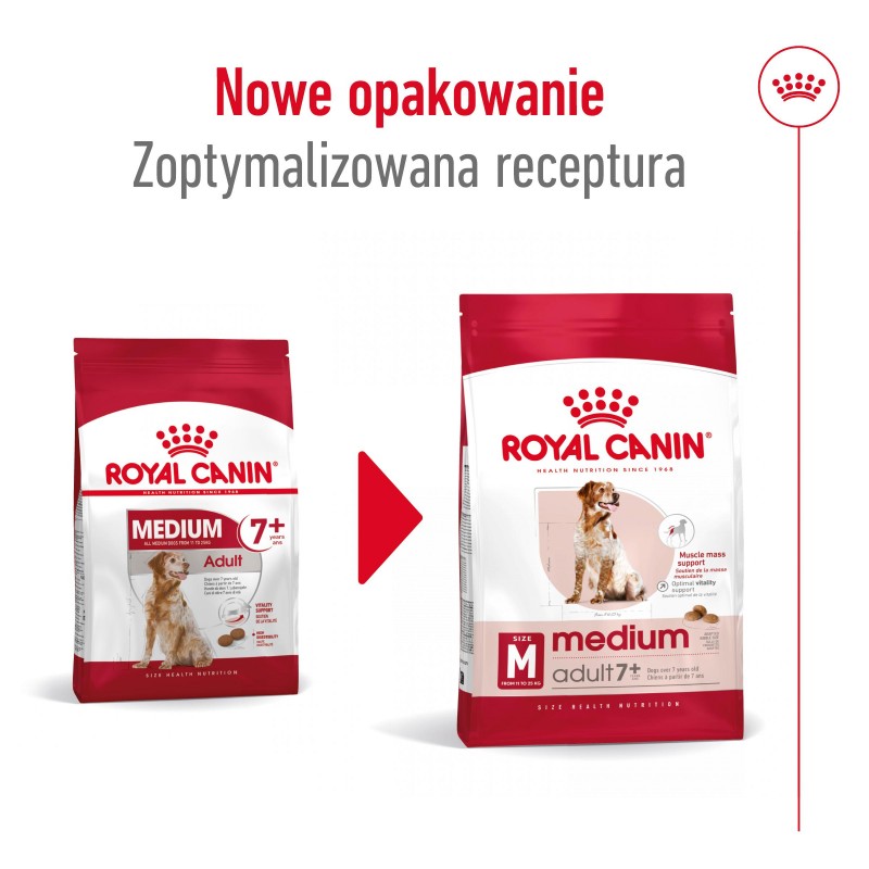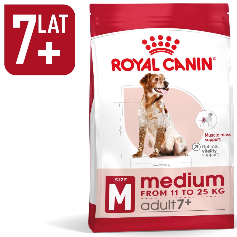 Uszkodzone opakowanie. Waga 14kg. Termin ważności 11.09.2026. Karma ROYAL CANIN® Medium Adult 7+ została opracowana specjalnie dla dojrzałych psów ras średnich, o masie 11-25 kg, powyżej 7 roku życia.