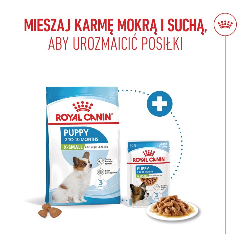 Karma ROYAL CANIN® X-Small Puppy opracowana specjalnie dla szczeniąt do 10 miesiąca życia, pokrywa wszystkie potrzeby pokarmowe szczeniąt ras bardzo małych, osiągających w dorosłości masę ciała nie większą niż 4 kg.