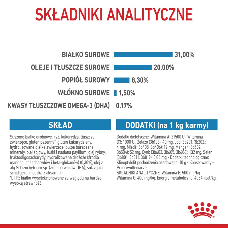 - suszone białko drobiowe, ryż, kukurydza, tłuszcze zwierzęce, gluten pszenny*, gluten kukurydziany, hydrolizowane białka zwierzęce, wysłodki buraczane, minerały, olej sojowy, łuski i nasiona psyllium, olej rybny, fruktooligosacharydy, hydrolizowane drożdże (źródło mannooligosacharydów i beta-glukanów) (0,30%), olej z alg Schizochytrium sp. (źródło kwasów DHA), sok z juki schidigera, mączka z aksamitki.