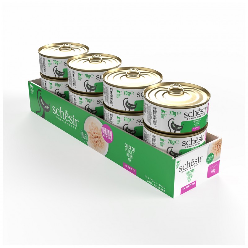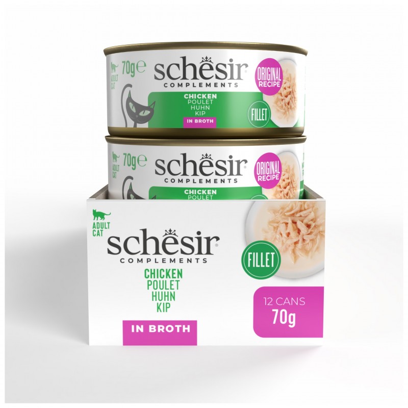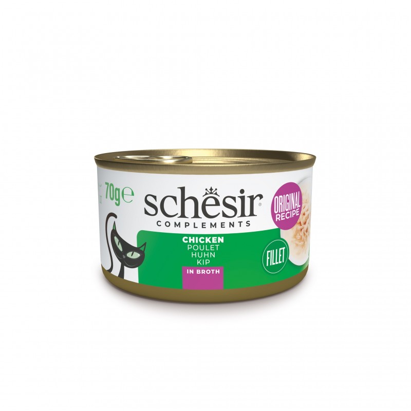 Schesir, wierny swojej filozofii naturalności i najwyższej jakości, starannie dobiera filety z kurczaka, poddając je delikatnemu gotowaniu na parze i minimalnemu przetworzeniu, aby zachować ich świeżość i naturalną strukturę. Aksamitny, aromatyczny bulion dodatkowo zwiększa smakowitość posiłku i zapewnia lekkość oraz odpowiednie nawodnienie — szczególnie cenione przez koty, które uwielbiają wilgotne, lekkie i bardzo naturalne kompozycje.