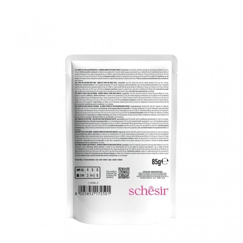 Schesir tworzy karmy, które łączą czystość natury z najwyższą jakością – i dokładnie tak powstała ta pełnoporcjowa mokra karma z tuńczykiem, kurczakiem i szynką , przygotowana specjalnie z myślą o dorosłych kotach o wyrafinowanym smaku.