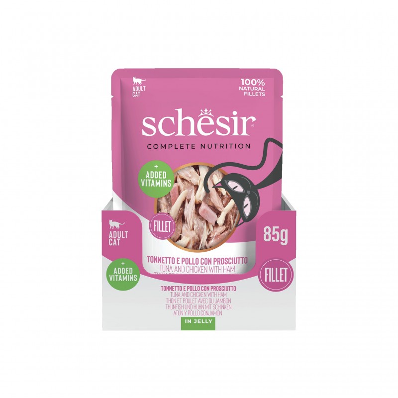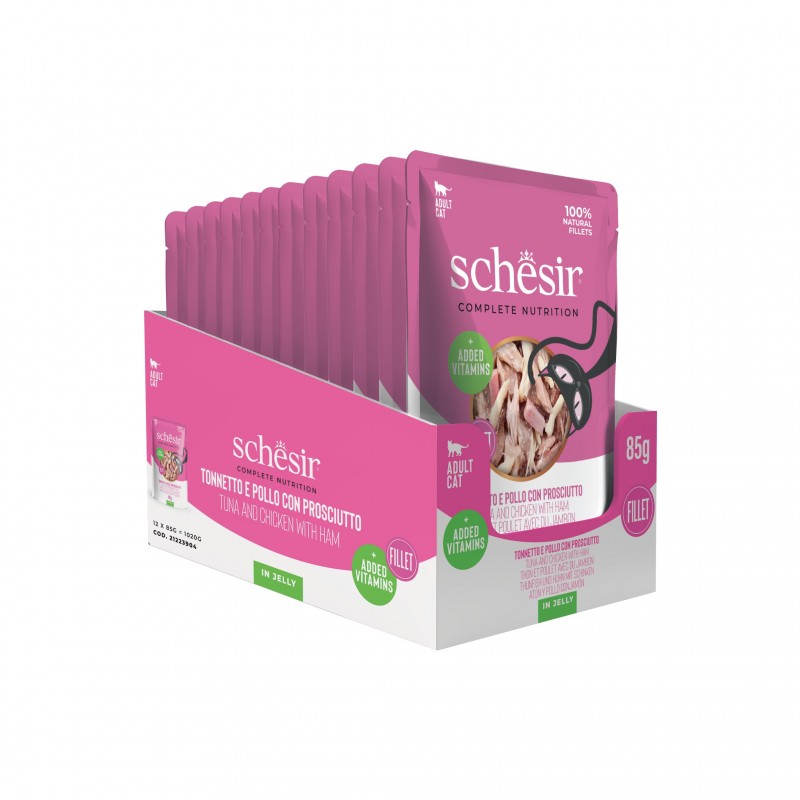 Schesir dokłada wszelkich starań, aby każda porcja była tak naturalna, jak to tylko możliwe. Tuńczyk poławiany na otwartym morzu, starannie dobrane mięso kurczaka oraz wyrazista szynka tworzą kompozycję bogatą w białko i jednocześnie lekką dla układu pokarmowego kota. Ręczne przygotowanie i minimalny stopień przetworzenia sprawiają, że posiłek jest zgodny z biologicznymi potrzebami drapieżnika. Delikatna galaretka zwiększa smakowitość, wspiera odpowiednie nawodnienie i ułatwia jedzenie, a niska zawartość węglowodanów idealnie dopasowuje się do naturalnej kociej diety.