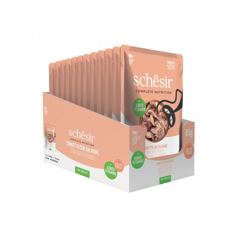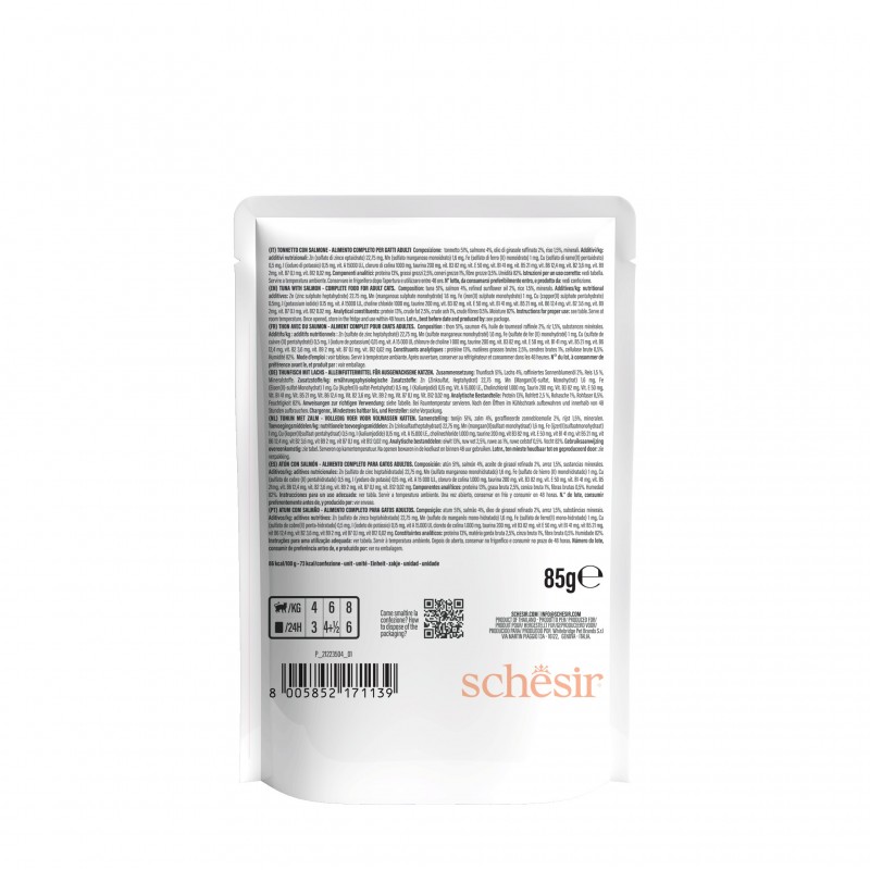 Schesir dokłada wszelkich starań, aby każda porcja była tak naturalna, jak to tylko możliwe. Tuńczyk poławiany na otwartym morzu oraz starannie wyselekcjonowany łosoś tworzą wysokobiałkowy, minimalnie przetworzony posiłek, który odpowiada biologicznym potrzebom kota. Ręczne przygotowanie składników i delikatne gotowanie na parze pozwalają zachować naturalną strukturę filetów i ich pełny aromat. Galaretka dodatkowo zwiększa smakowitość, wspiera prawidłowe nawodnienie i ułatwia jedzenie, szczególnie kotom preferującym wilgotne, lekkie konsystencje. Niska zawartość węglowodanów idealnie wpisuje się w naturalny model żywienia drapieżników.