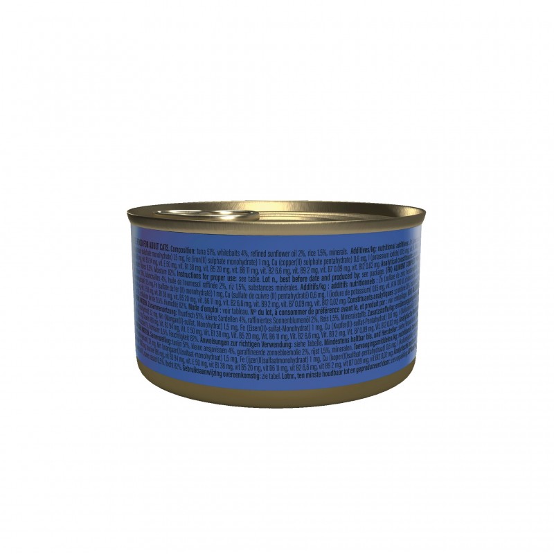 - tuńczyk 51%, drobne smażone ryby 4%, rafinowany olej słonecznikowy 2%, ryż 1,5%, minerały.