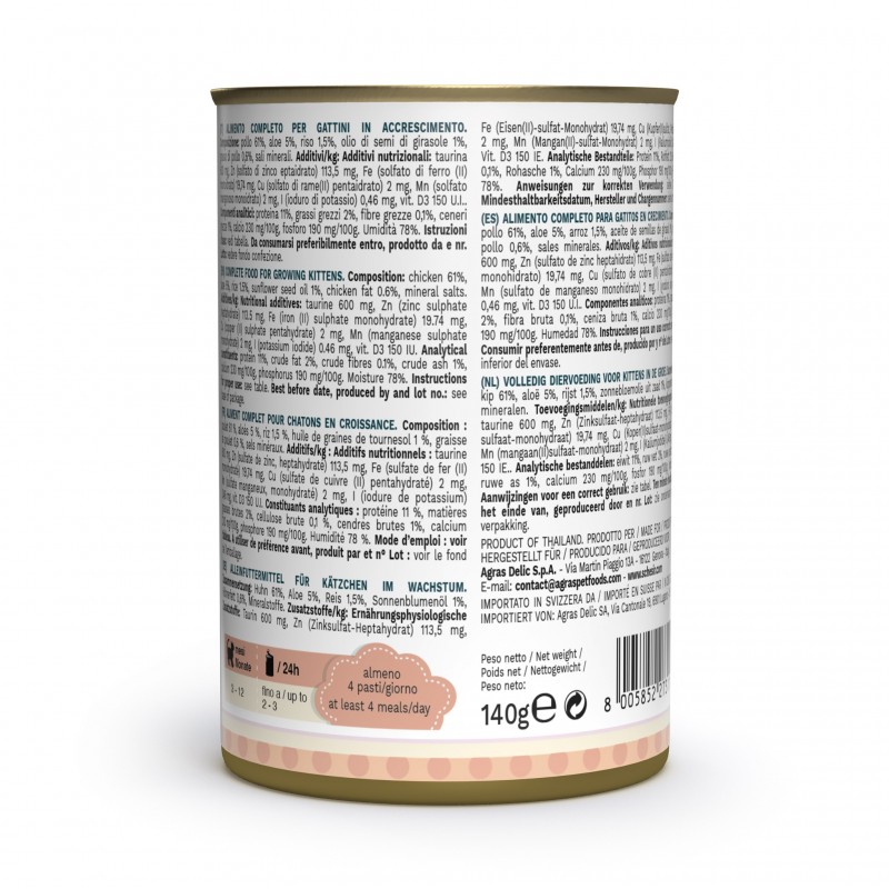 Soczysta galaretka nadaje karmie wyjątkową smakowitość oraz wspiera prawidłowe nawodnienie młodego organizmu. Dodatek aloesu wspomaga delikatny układ pokarmowy kociąt i pomaga budować naturalną odporność, natomiast olej z nasion słonecznika dostarcza cennych kwasów tłuszczowych omega-3 i omega-6, wspierających zdrową skórę oraz lśniącą sierść.