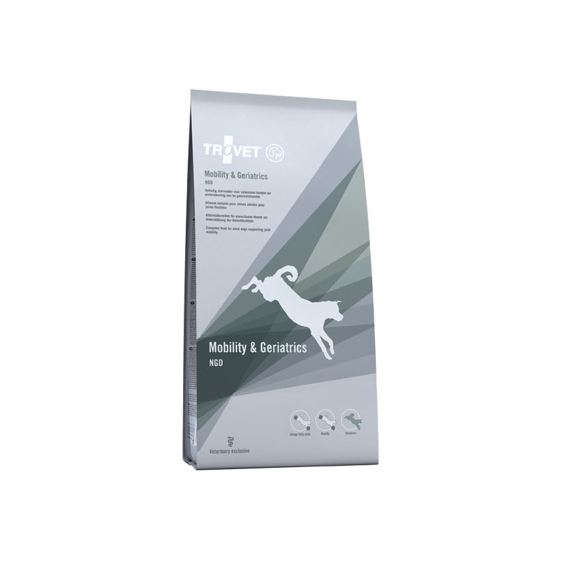 Karma dietetyczna Mobility & Geriatrics została specjalnie opracowana, aby wspierać starsze psy z problemami stawów (może być również stosowana zapobiegawczo). Żywność dietetyczna TROVET zawiera produkty naturalne. Składniki aktywne, takie jak diabelski pazur i żywica Boswellia, pomagają zapobiegać dalszej degeneracji chrząstki i działają przeciwzapalnie. Połączenie żelatyny, glukozaminy i chondroityny stanowi budulec dla chrząstki stawowej. Dodane kwasy tłuszczowe z oleju rybnego mają udowodnione działanie przeciwzapalne i pomagają zmniejszyć ból podczas ruchu. W rezultacie często można ograniczyć stosowanie leków przeciwbólowych, a czasami można je całkowicie pominąć. Zmniejszona zawartość energii może pomóc zmniejszyć nadwagę. Ponadto w karmie zmniejszona została zawartość fosforu i białka, aby zmniejszyć obciążenie nerek.
