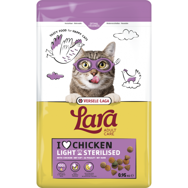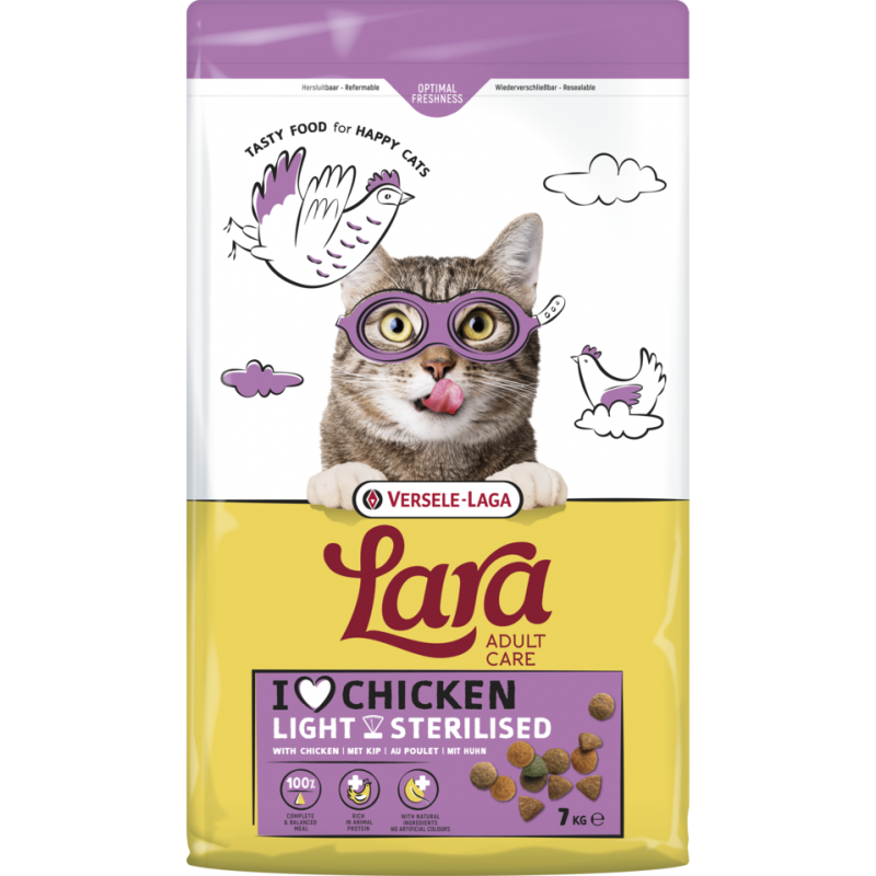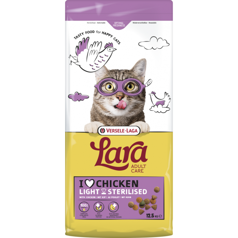 VERSELE-LAGA Lara Adult Care Light Sterilised with Chicken – lekka, pyszna karma z kurczakiem dla kotów po sterylizacji i mniej aktywnych. 100% kompletna i zbilansowana, bogata w białko zwierzęce oraz naturalne składniki, w tym spirulinę. Bez sztucznych barwników, wspiera kontrolę wagi i zdrową sylwetkę.