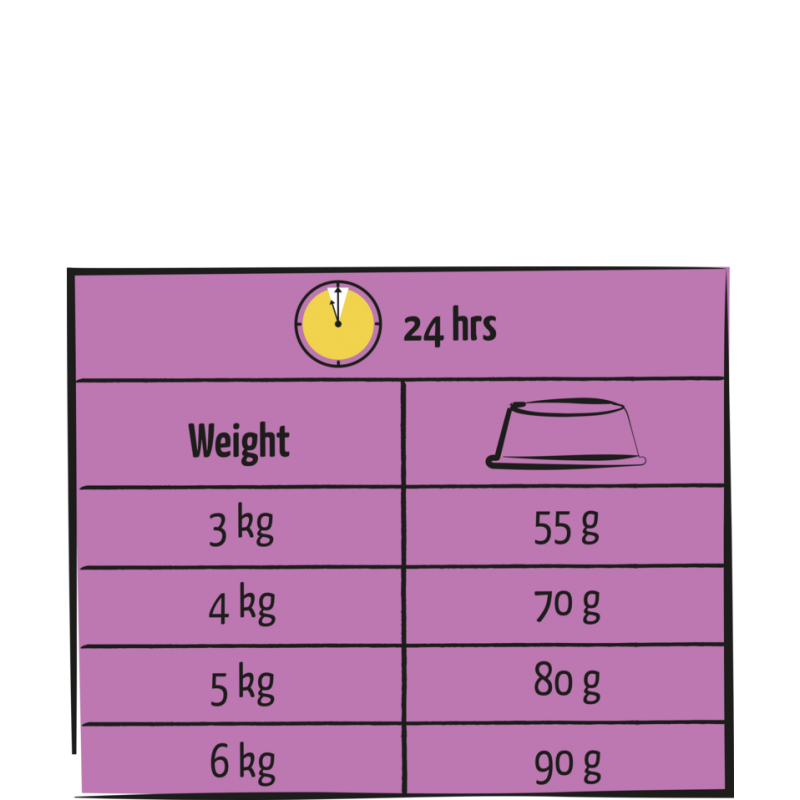 - białko 34,0%, zawartość tłuszczu 9,0%, włókno surowe 4,0%, popiół surowy 8,5%, wapń 1,1%, fosfor 1,0%, tauryna 0,2%