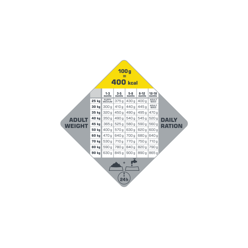 - Zbilansowany poziom minerałów i aminokwasów – wspiera wzrost zgodny z idealną krzywą rozwoju ras dużych.