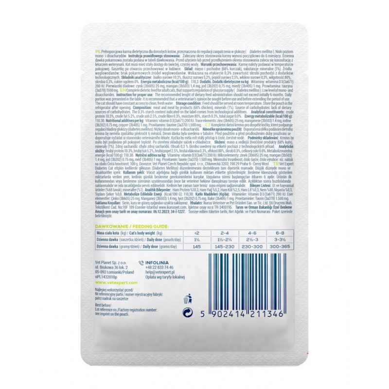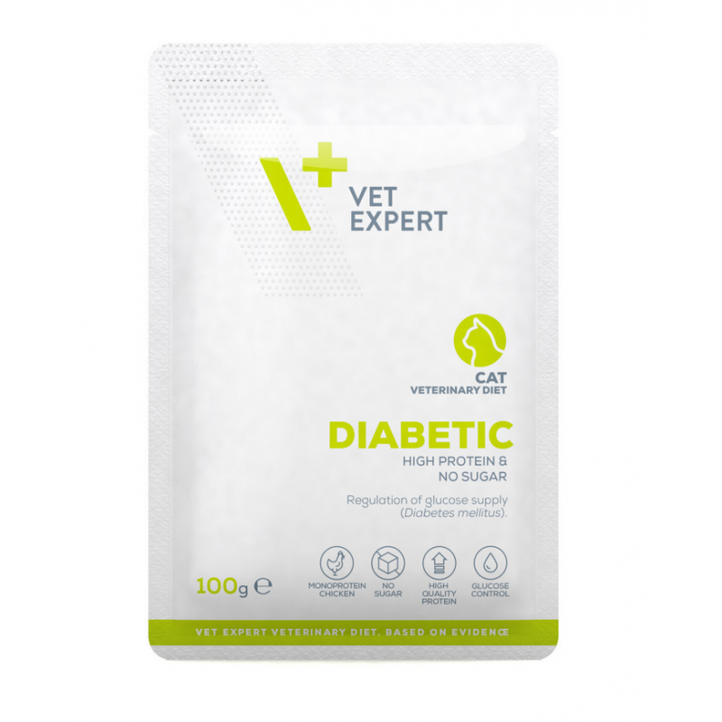 VetExpert Diabetic Cat 100 g to karma weterynaryjna dla kota z cukrzycą, regulacja poziomu cukru i wsparcie metabolizmu.