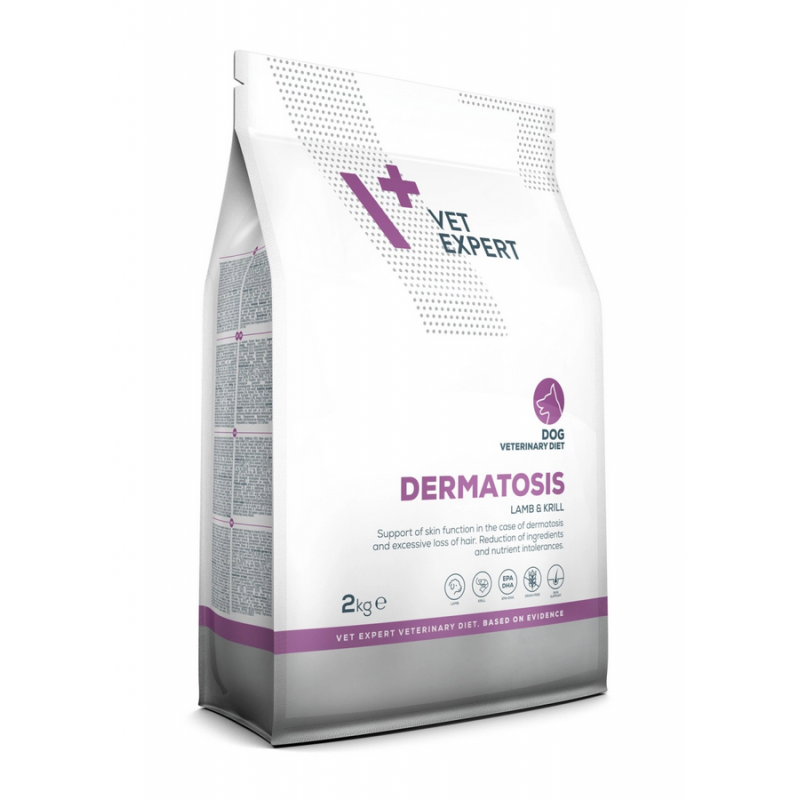VetExpert Dermatosis Dog Lamb & Krill 2 kg to karma dla psa na alergie pokarmowe, skórę i sierść.