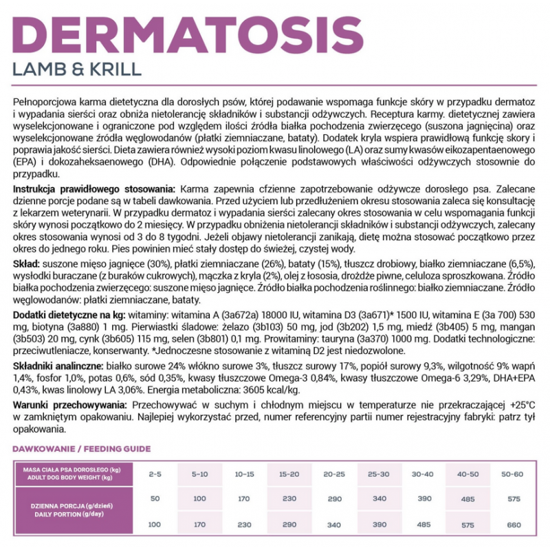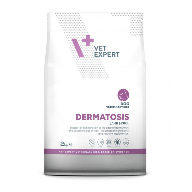 VETEXPERT 4T Vet. Diet Dog Dermatosis Lamb & Krill 2 kg to pełnoporcjowa, kompletna karma dietetyczna dla psów dorosłych, opracowana w celu obniżenia nietolerancji pokarmowych oraz wsparcia funkcji skóry w przypadku dermatoz i nadmiernego wypadania sierści. To specjalistyczna dieta, która łączy wysoką jakość składników z funkcjonalnym działaniem wspierającym zdrowie i komfort Twojego psa.