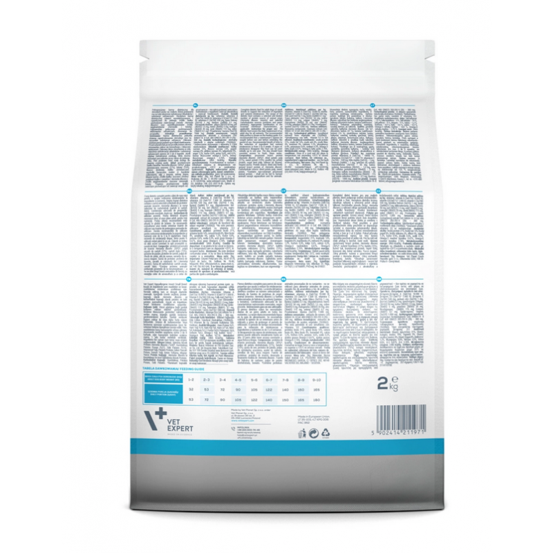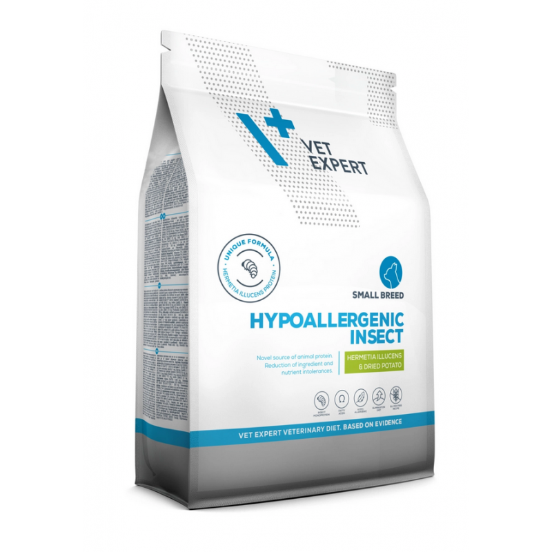 VETEXPERT 4T Vet. Diet Dog Hypoallergenic Insect Small Breed 2 kg to specjalistyczna karma weterynaryjna dla dorosłych psów ras małych, opracowana w celu redukcji nietolerancji pokarmowych oraz wsparcia zdrowia skóry i sierści. Formuła oparta na unikatowym, monobiałkowym źródle białka – larwach owadów Hermetia illucens – minimalizuje ryzyko reakcji alergicznych i stanowi nowoczesne rozwiązanie dla psów o wrażliwym układzie pokarmowym.