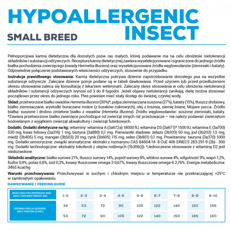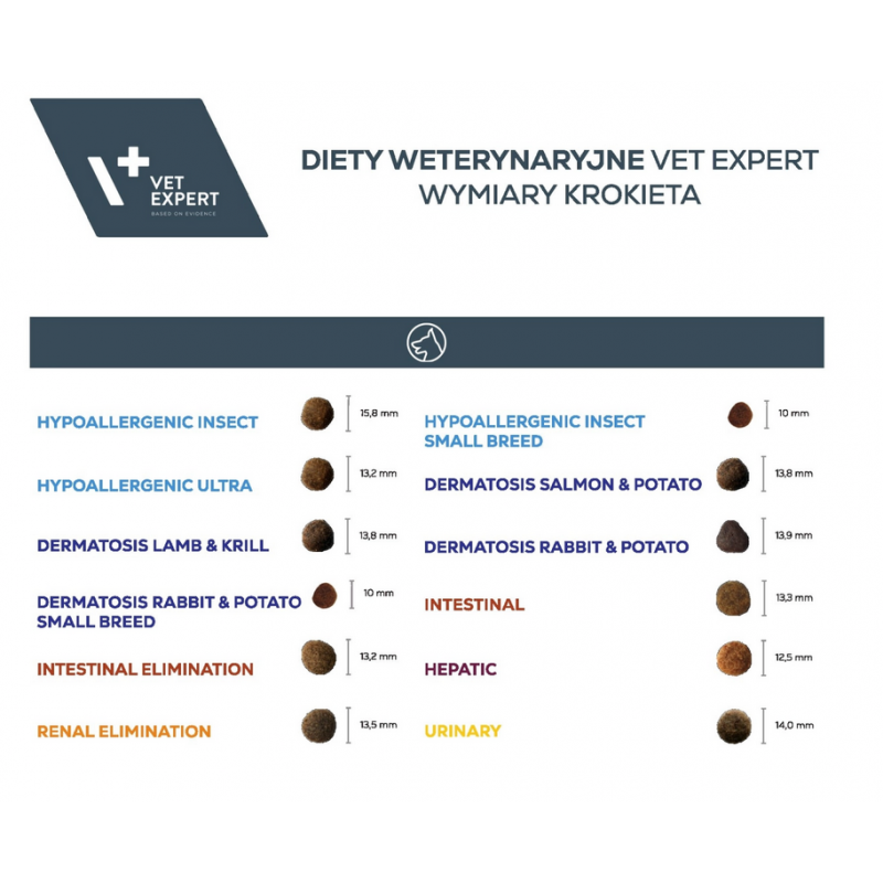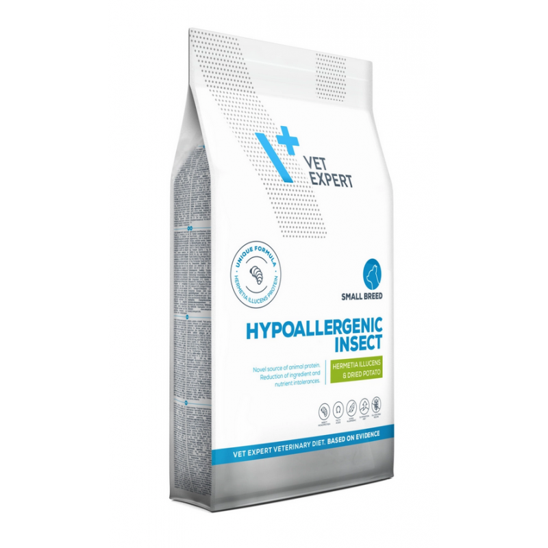 VETEXPERT 4T Vet. Diet Dog Hypoallergenic Insect Small Breed 8 kg to specjalistyczna karma weterynaryjna dla dorosłych psów ras małych, opracowana w celu redukcji nietolerancji pokarmowych oraz wsparcia zdrowia skóry i sierści. Formuła oparta na unikatowym, monobiałkowym źródle białka – larwach owadów Hermetia illucens – minimalizuje ryzyko reakcji alergicznych i stanowi nowoczesne rozwiązanie dla psów o wrażliwym układzie pokarmowym.