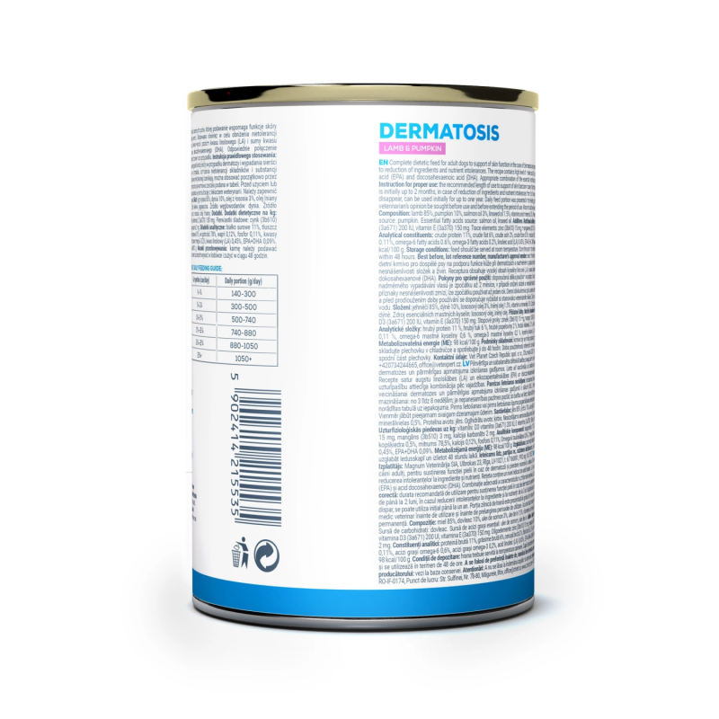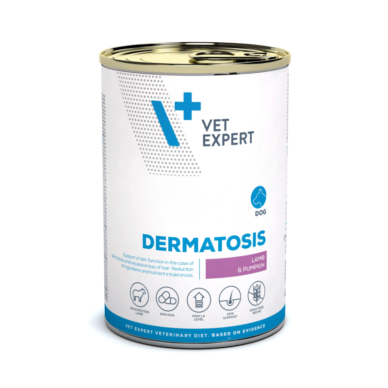 VETEXPERT Dermatosis Lamb & Pumpkin to specjalistyczne rozwiązanie żywieniowe, które łączy hipoalergiczne źródło białka z klinicznie wspieraną ochroną skóry. Wspomaga poprawę komfortu życia psa z problemami dermatologicznymi, ogranicza objawy skórne i wspiera zdrowy wygląd sierści – pozostając przy tym delikatną i dobrze tolerowaną nawet przez psy wrażliwe.