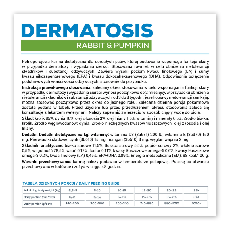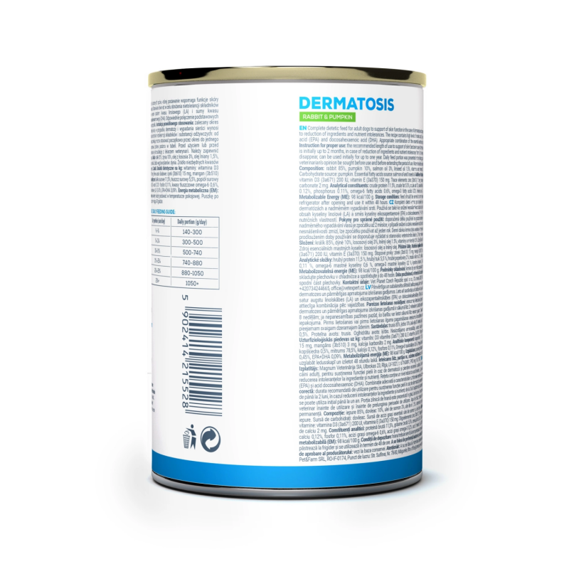 VETEXPERT Dermatosis Rabbit & Pumpkin to mokra karma weterynaryjna dla psów z problemami skórnymi, dermatozami i nadmiernym wypadaniem sierści. Zawiera królika jako hipoalergiczne źródło białka, dynię wspierającą trawienie oraz wysoki poziom kwasu linolowego, EPA i DHA, które odbudowują barierę lipidową skóry, redukują świąd i poprawiają kondycję sierści.