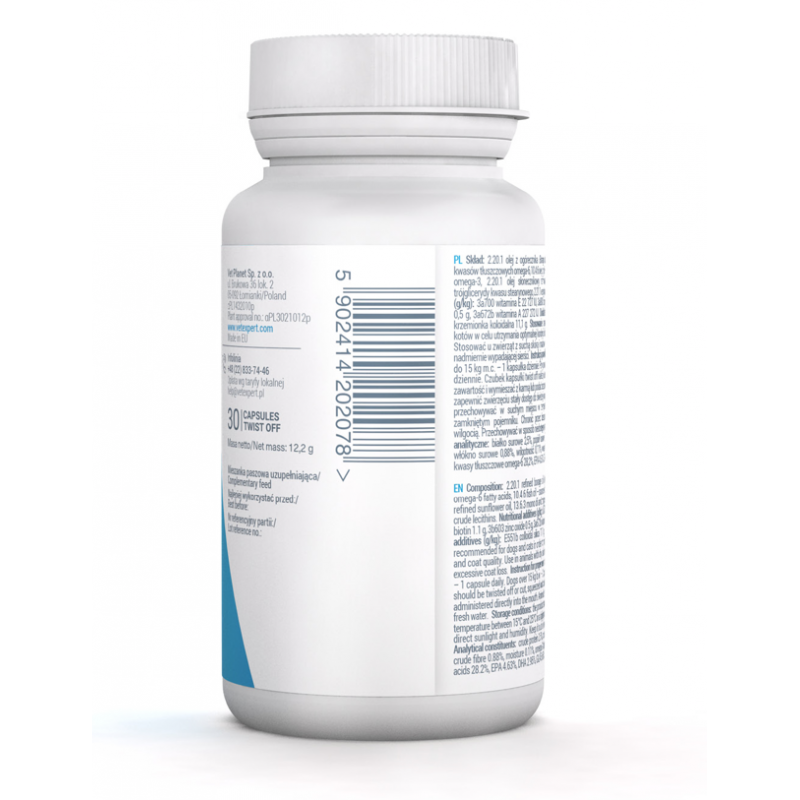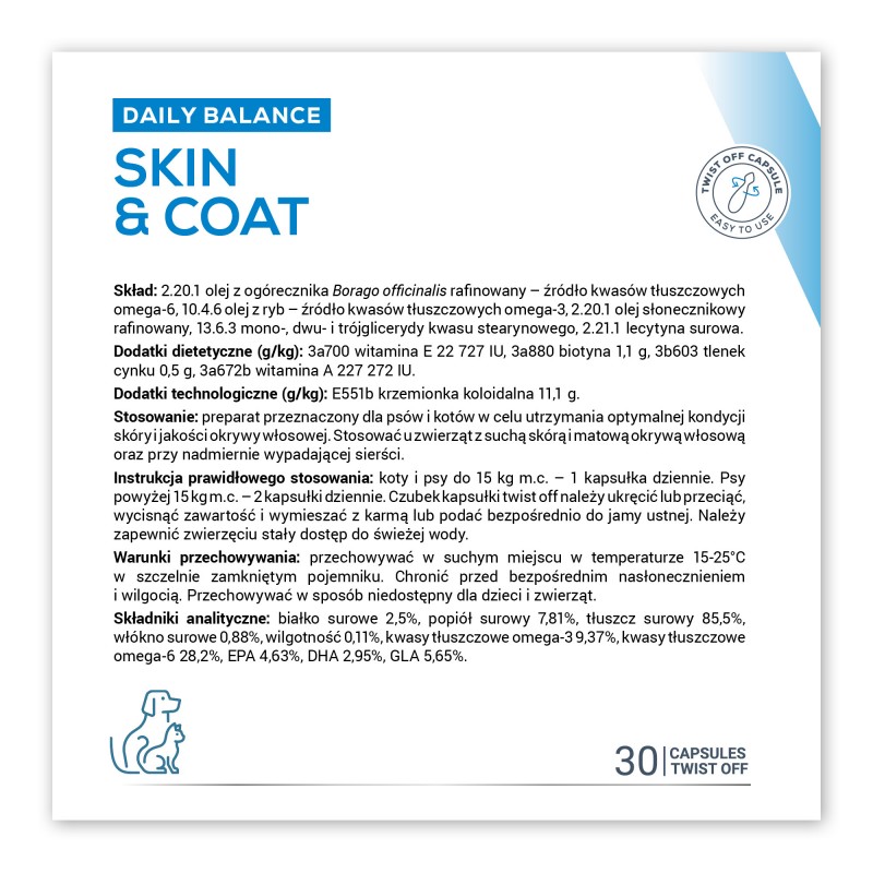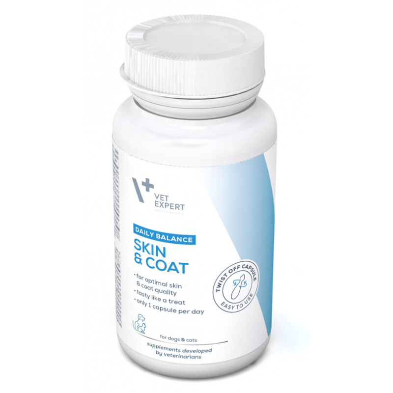VETEXPERT Skin and Coat to innowacyjny preparat stworzony z myślą o poprawie kondycji skóry i sierści psów oraz kotów. Doskonały dla zwierząt z suchą, wrażliwą skórą, matową okrywą włosową czy nadmiernym wypadaniem sierści. Unikalna formuła kapsułek Twist Off gwarantuje łatwość stosowania i wysoką smakowitość, co czyni preparat wygodnym i skutecznym rozwiązaniem.
