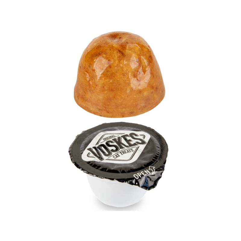 Voskes Jelly Cups Tuna & Chicken – przysmak dla kota w galaretce. Mięsno-rybne kąski w delikatnej galaretce – wyjątkowa uczta dla kota.