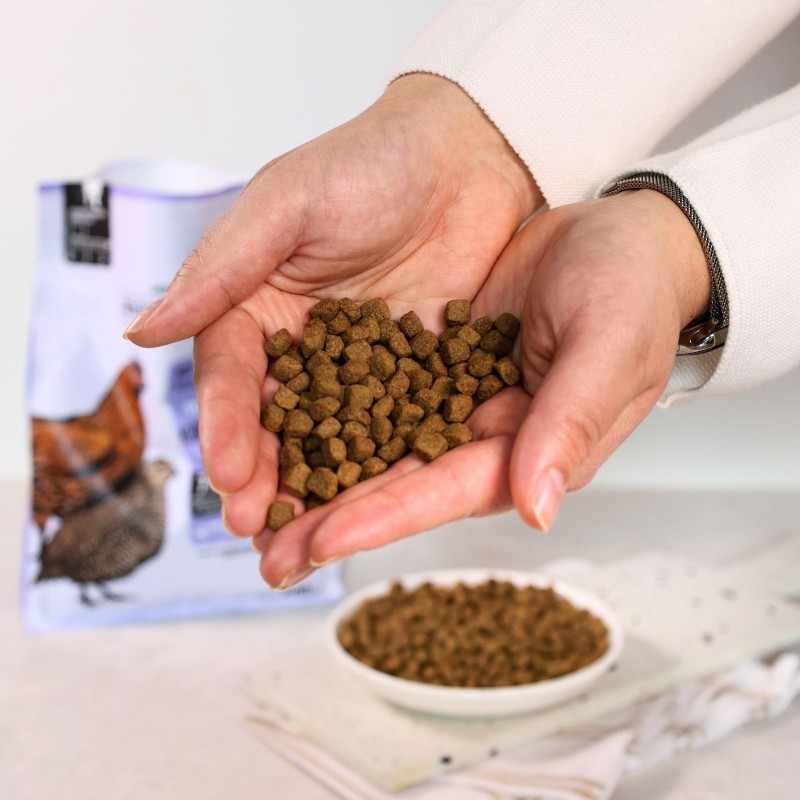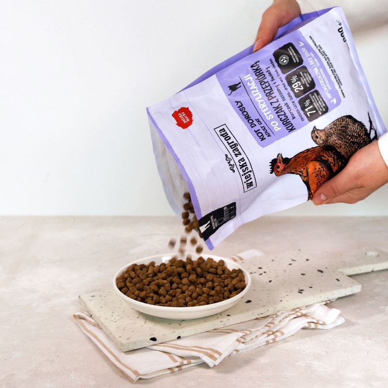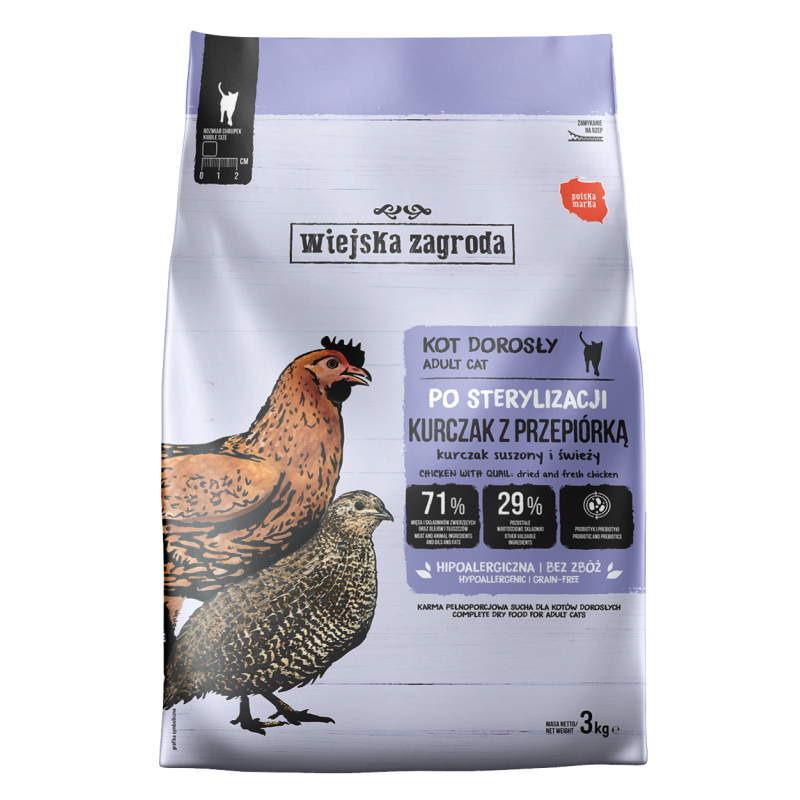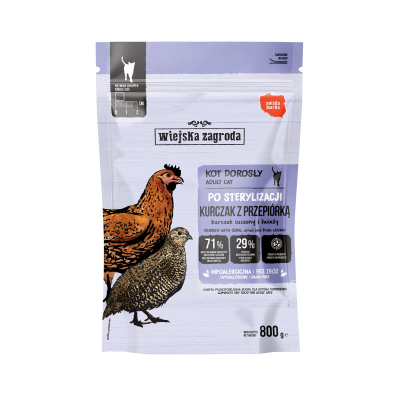 WIEJSKA ZAGRODA Kurczak z przepiórką – karma sucha dla kota po sterylizacji to pełnoporcjowa, bezzbożowa receptura stworzona z myślą o dorosłych kotach po zabiegu kastracji lub sterylizacji, które wymagają kontroli masy ciała i wsparcia metabolizmu bez kompromisów w kwestii smaku i jakości.
