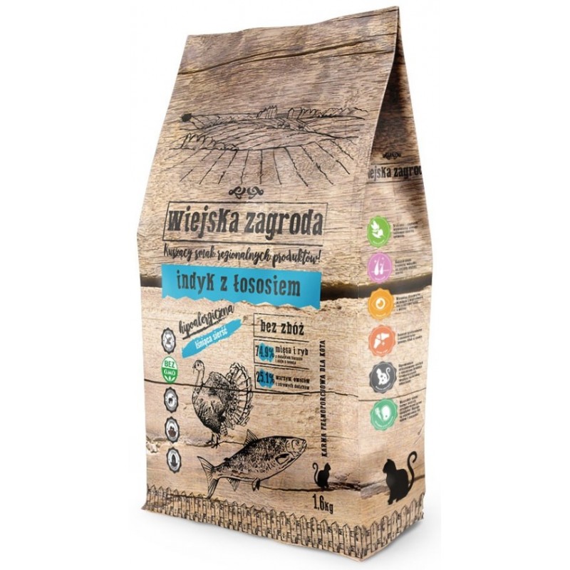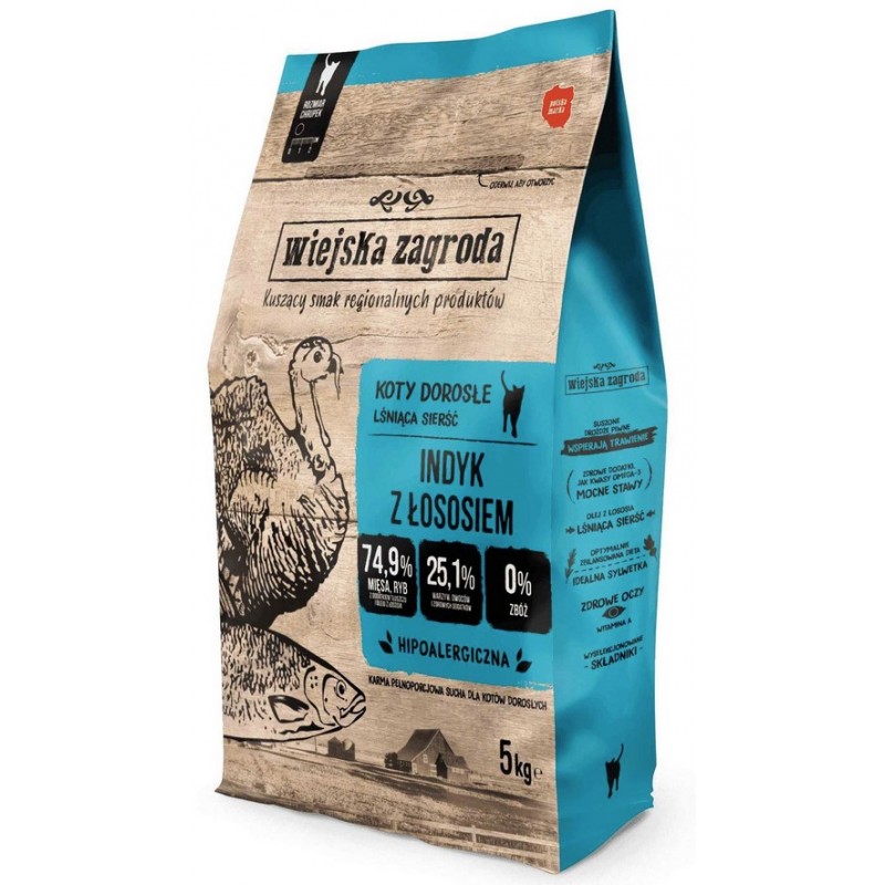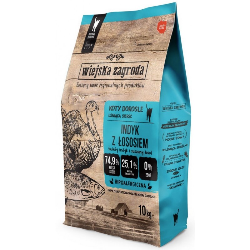 Krótki termin ważności 05.12.2025. Pełnoporcjowa karma Wiejska Zagroda o smaku indyka z łososiem dla dorosłego kota.
