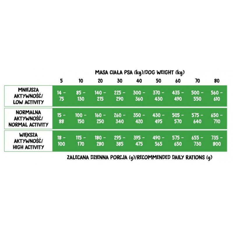 Podane w tabeli dzienne zapotrzebowanie jest orientacyjne. Każdy pies jest inny i ma różne potrzeby. Obserwuj swojego zwierzaka i zwiększ lub zmniejsz porcję dzienną karmy w razie potrzeby. Pamiętaj, aby zapewnić mu stały dostęp do świeżej wody!
