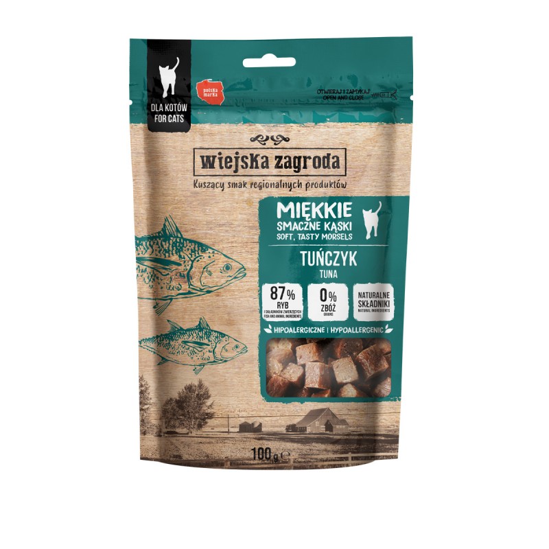 Wiejska Zagroda Miękkie Smaczne Kąski Tuńczyk 100 g – naturalny przysmak dla dorosłych kotów z 87% tuńczyka. Miękkie, aromatyczne kąski idealne jako zdrowa nagroda dla kotów wrażliwych i wybrednych