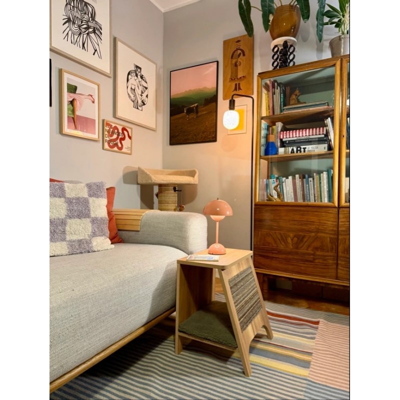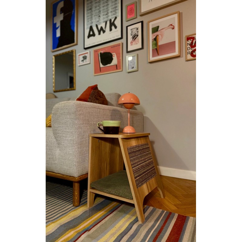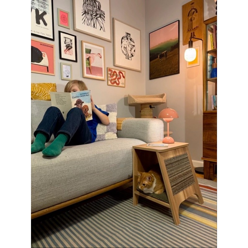 - Materiał: MDF melaminowany (FSC®), sizal, tkanina, syntetyczne futerko (poducha)