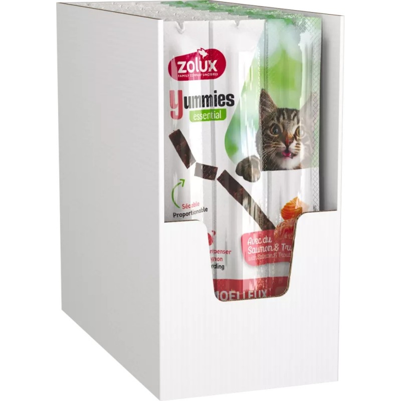 ZOLUX Yummies miękkie przysmaki dla kota pałeczki łosoś pstrąg 3x5 g to aromatyczna przekąska o rybnym smaku z dodatkiem tauryny i witamin A oraz D3.