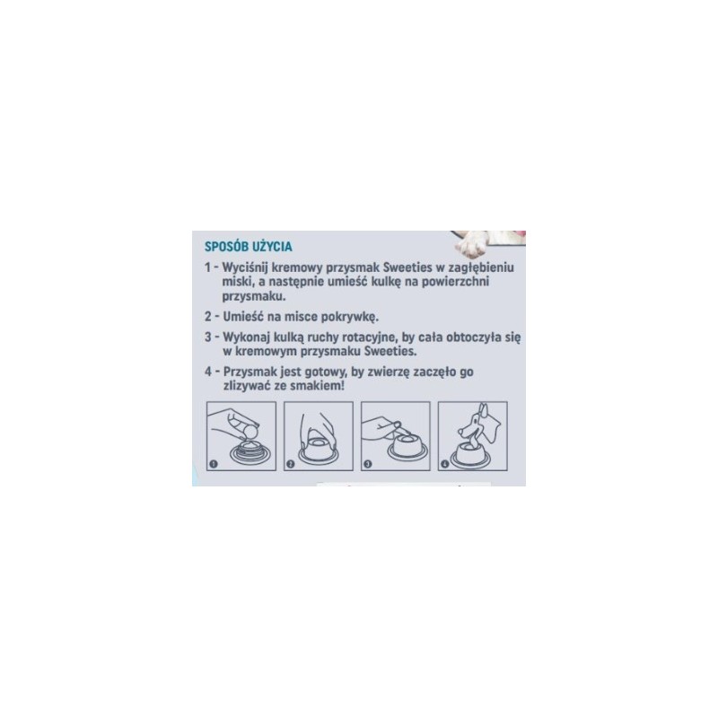 - Innowacyjny design z kulką – specjalne wgłębienia oraz ruchoma kulka równomiernie rozprowadzają kremowe przysmaki Sweeties, motywując psa do aktywnego lizania.